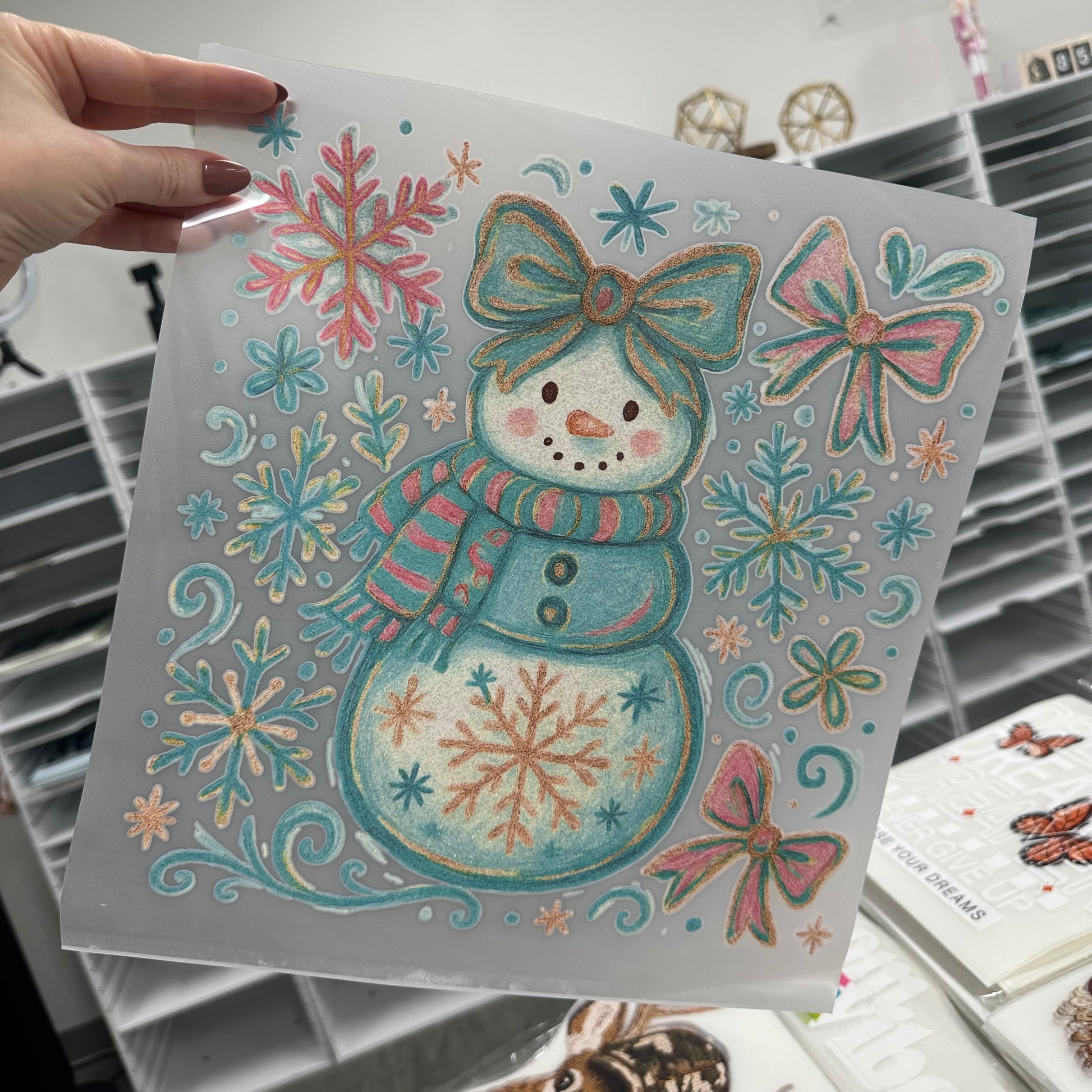 GLITTER snowgirl clear film screen print